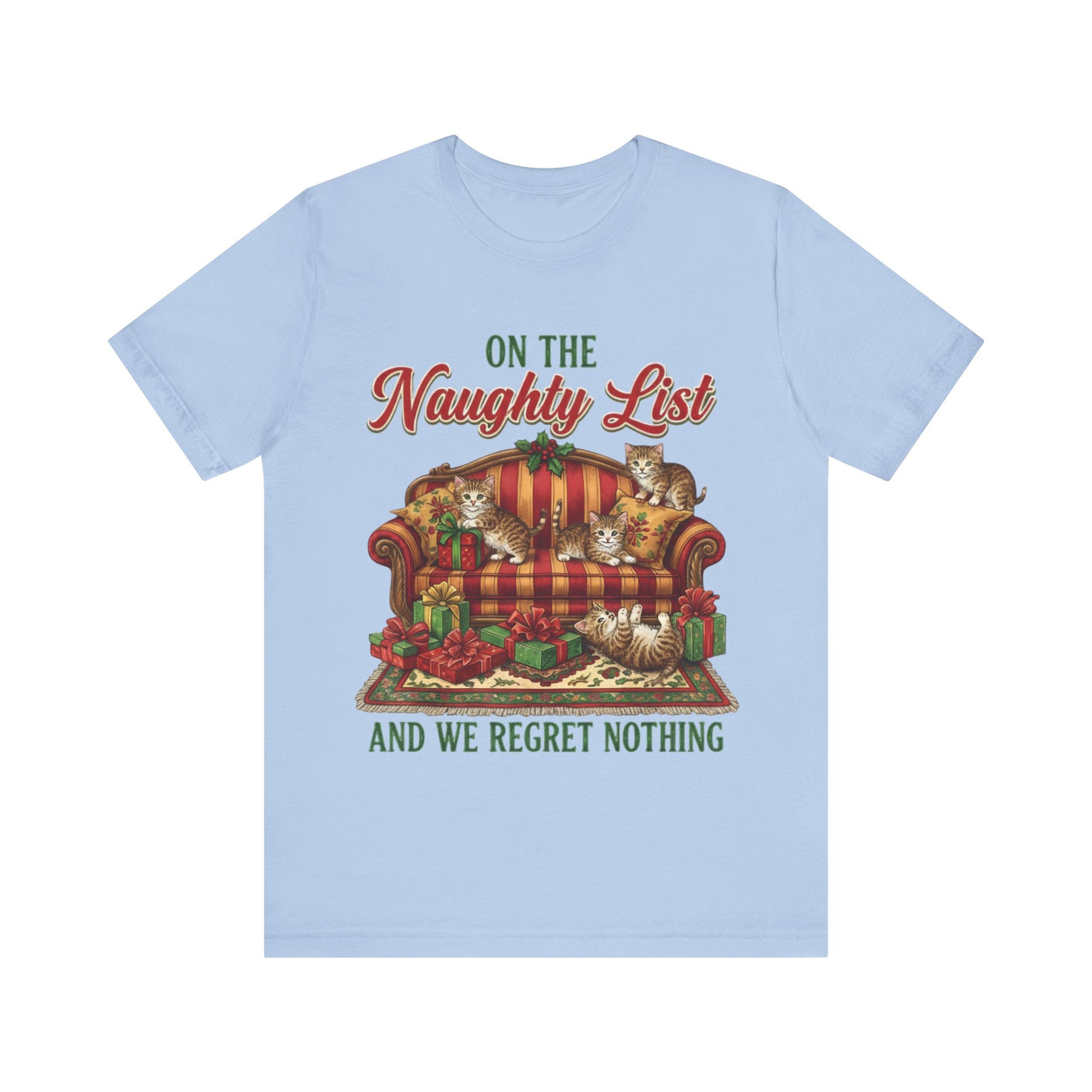 A soft, lightweight tee that brings holiday mischief to cozy winter days. This crew-neck shirt features a vintage-style illustration of playful kittens sprawled across a plaid sofa among wrapped presents, captioned “On the Naughty List and We Regret Nothing.” It reads like a wink from someone who prefers laughter to perfection—easy to layer under a cardigan or wear on its own for low-key seasonal gatherings. Breathable cotton keeps you comfortable whether you’re wrapping gifts, visiting friends, or lounging by the tree. The design’s warm, muted palette and finely detailed print give a nostalgic, homey vibe that feels familiar and fun.