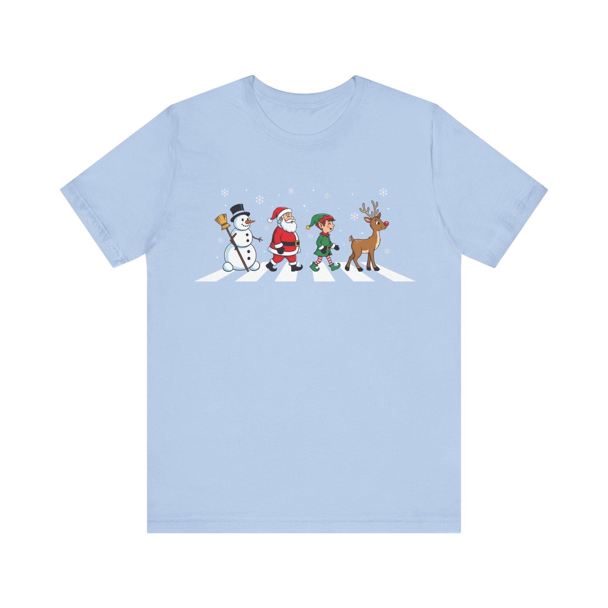 A soft, lightweight tee that brings playful holiday cheer to everyday wear. The front artwork shows a snowman, Santa, an elf and a reindeer crossing a stylized zebra-crossing beneath falling snow — a whimsical nod to festive traditions and joyful city strolls. Breathable Airlume combed cotton keeps it comfortable for layering or moving through winter markets, while a retail crew neck and clean silhouette make it easy to dress up with a jacket or wear casually with jeans. The printed sleeve and neck label use modern direct-to-film/direct-to-garment techniques for crisp color and detail that hold up wash after wash. Offered in classic tones, this shirt hits a cheerful, low-key note for holiday gatherings, casual office celebrations, and cozy nights out with friends.