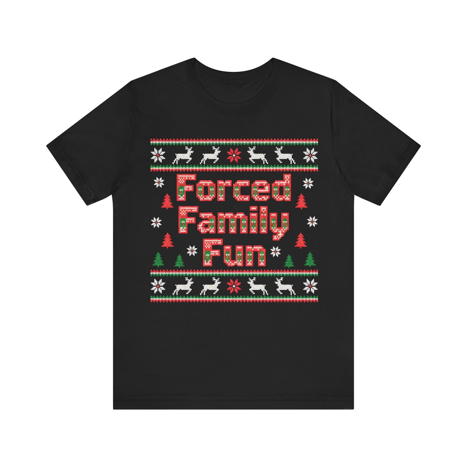 This lightweight crewneck tee wears like a holiday inside joke — cozy, casual, and just snarky enough to start conversations. The knit-style graphic reads “Forced Family Fun” in pixelated holiday reds and greens, framed by tiny reindeer, trees, and snowflakes. It drapes softly without feeling heavy, layers easily under a cardigan or over a long-sleeve, and keeps its shape thanks to side seams and a ribbed collar. Wear it to family dinners, road-trip stops, or low-key seasonal gatherings when you want to poke gentle fun at the whole togetherness ritual. The comfortable retail fit and breathable Airlume cotton make it easy to move around during chaotic cookie baking or last-minute gift runs — while the tear-away label keeps you comfortable through long visits. Thoughtfully produced with responsible manufacturing certifications, this tee blends playful attitude with everyday wearability.