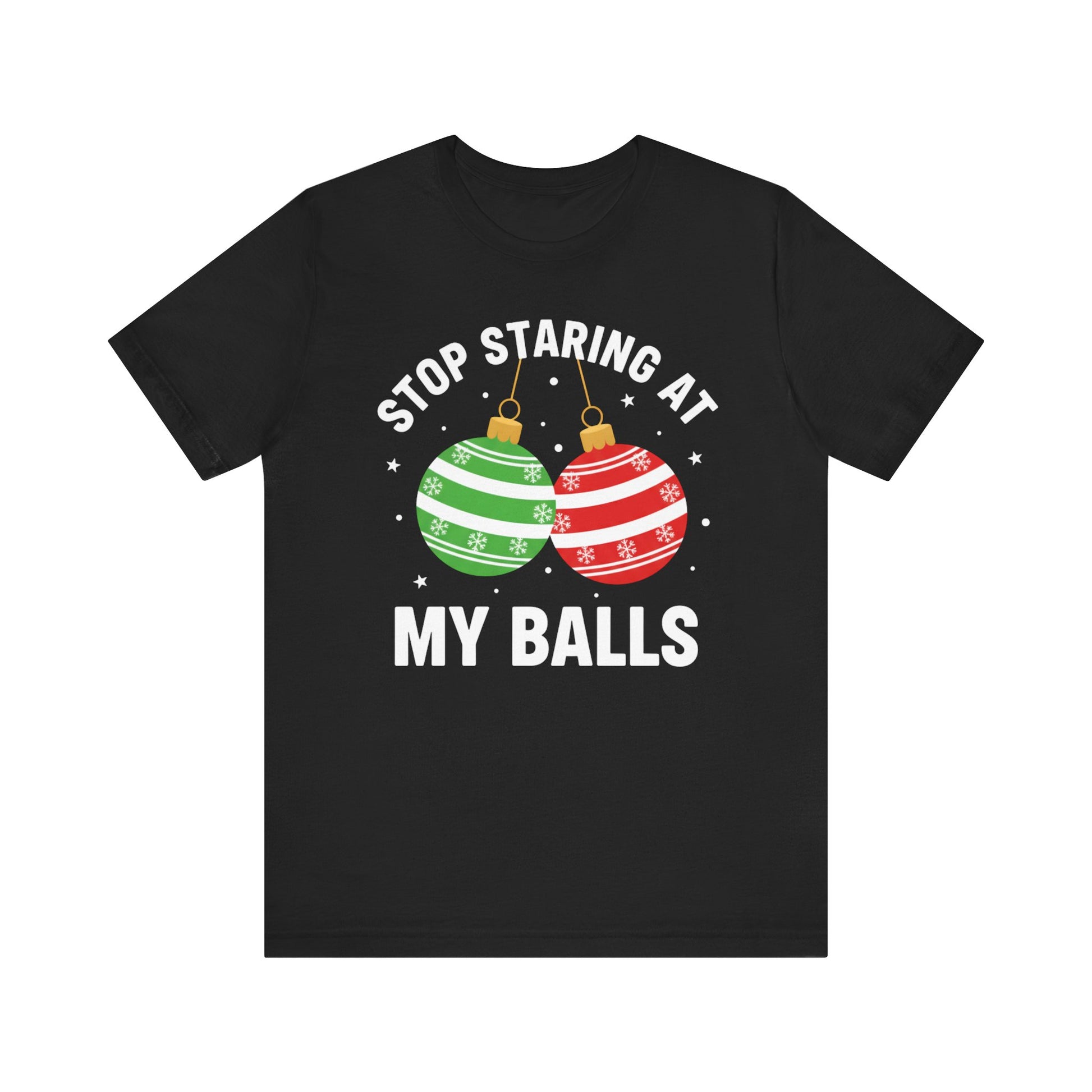 Lighthearted and cheeky, this soft cotton tee brings holiday mischief to your casual rotation. Two striped ornaments hang front-and-center beneath a bold, humorous slogan — the print pops with crisp colors and clean edges while the lightweight fabric keeps the shirt breathable and easy to layer. Wear it to low-key gatherings, ugly-sweater-style parties, or while wrapping gifts to spark laughs and start conversations. The retail cut and classic crew neckline let you style it up with a jacket or keep it simple with jeans.