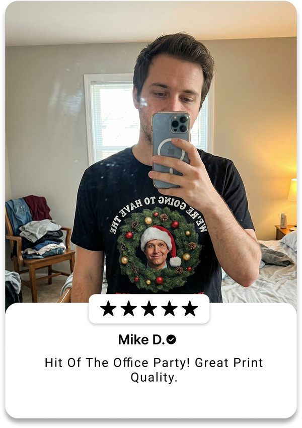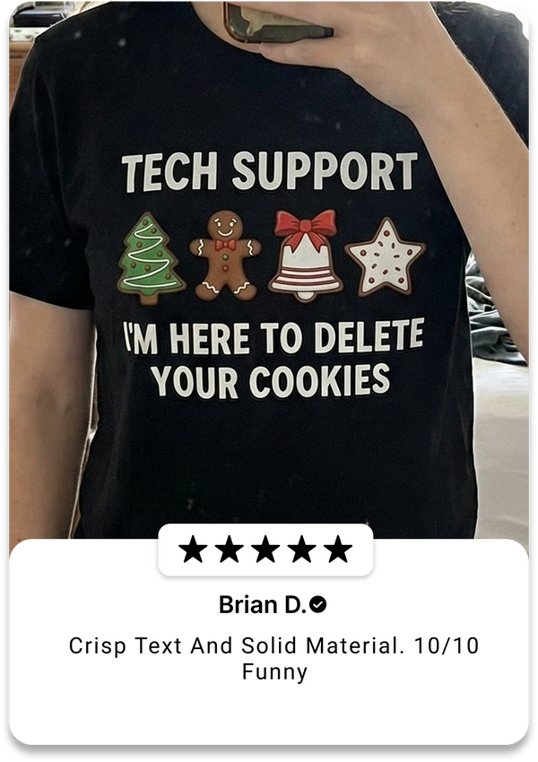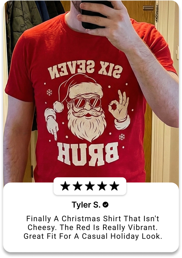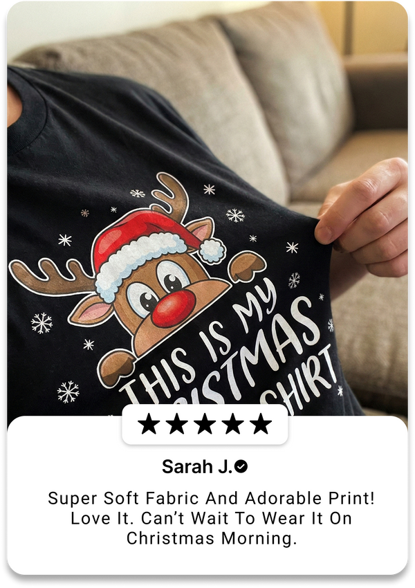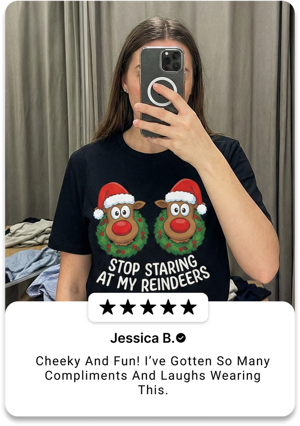 This lightweight cotton tee brings playful holiday humor to casual winter wardrobes. Two cheerful reindeer faces framed by wreaths and Santa hats sit front-and-center above a bold, tongue-in-cheek slogan. The soft, breathable fabric layers easily under jackets or wears solo at gatherings. It’s made for easy movement, everyday comfort, and a wink of festive mischief — the kind of shirt that starts conversations at cookie swaps, holiday markets, and laid-back family nights by the tree.